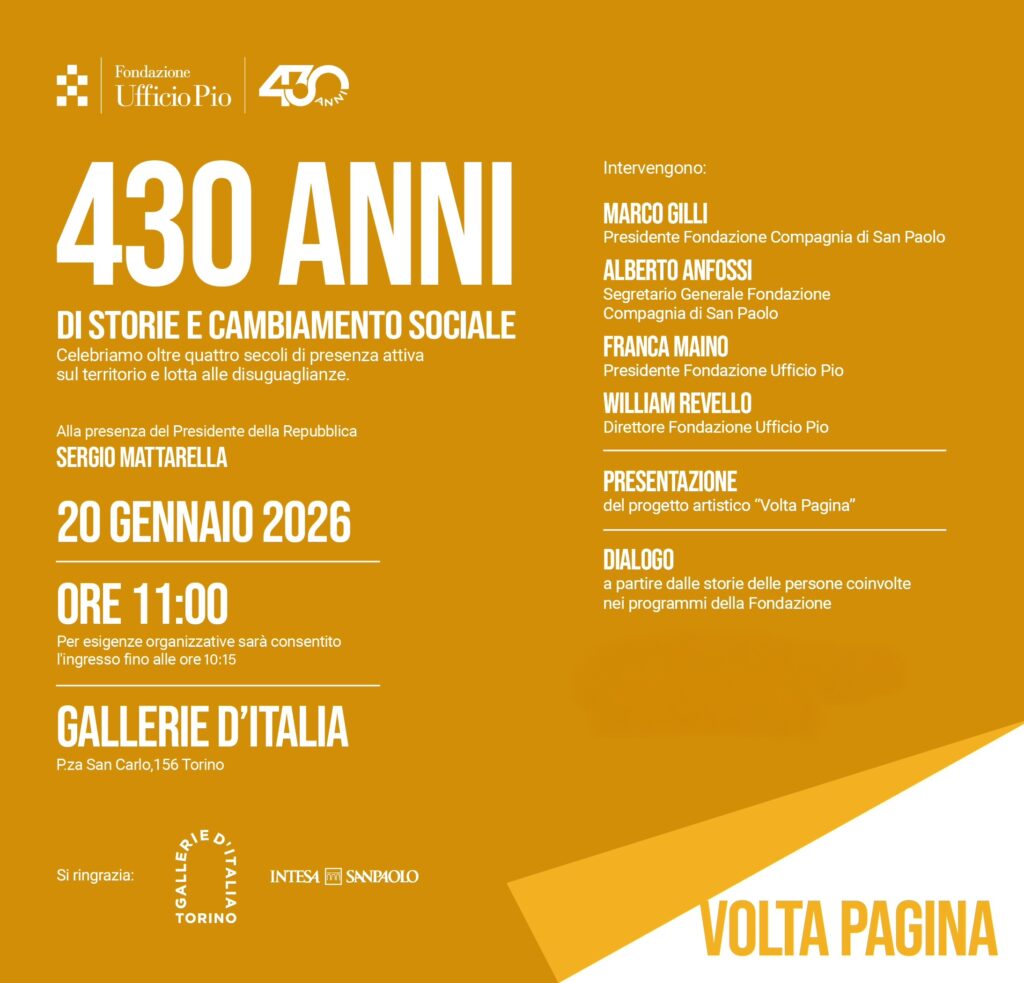 Martedì 20 gennaio, alle ore 11.00, il Presidente della Repubblica Sergio Mattarella prenderà parte all’evento istituzionale “430 anni di storie e cambiamento sociale” organizzato per il 430° anniversario della Fondazione Ufficio Pio. L’incontro si terrà presso le sale delle Gallerie d’Italia, in piazza San Carlo.